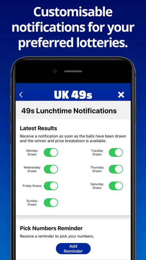 Get notified instantly when the latest lottery results become available. The App allows you to customise notifications based on which games and days of the week you play. There is also the option to set notifications at times that suit you - great for reminding you to purchase tickets before the draw.