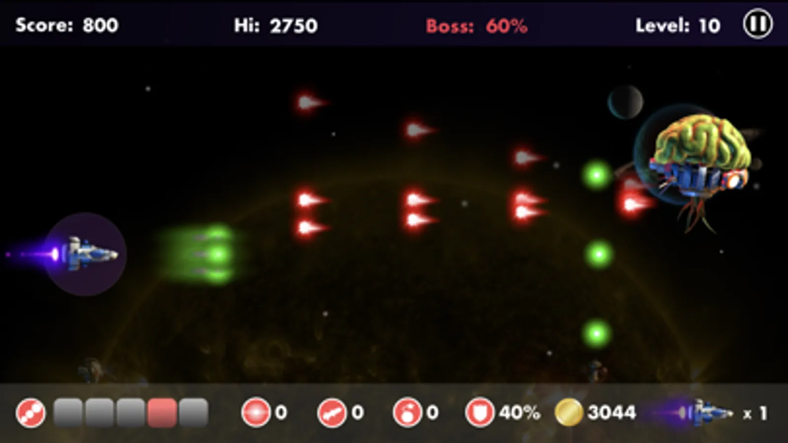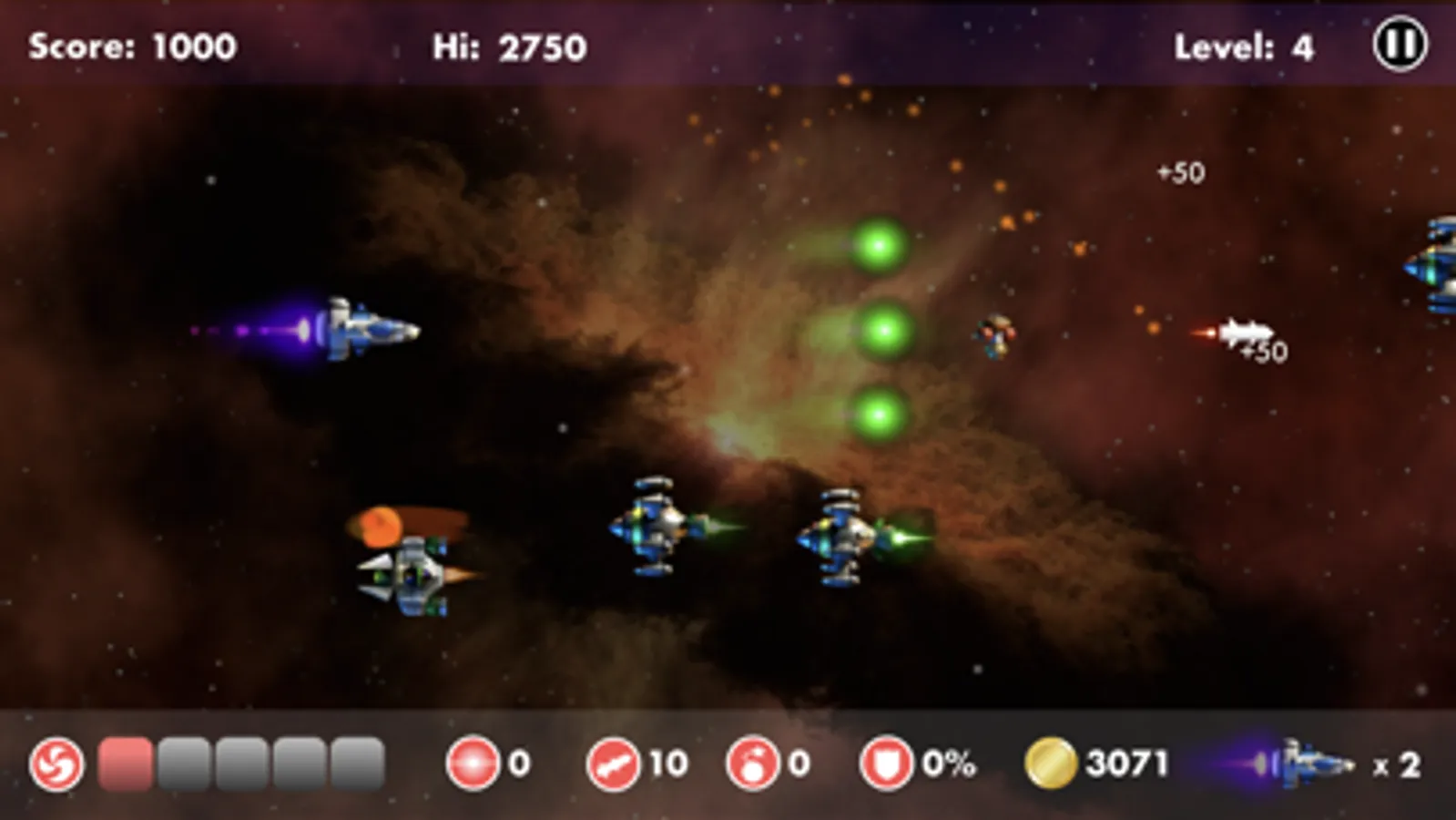 Battle through asteroid fields, and capture floating weapons across the screen to upgrade your ship's gun to fire spread rounds, fireballs, lightning, or missiles. Capture a floating sentinel orb to gain 30 extra shots alongside your current weapon, or grab a mega bomb to incinerate all enemies on the screen as you battle your way through the galaxy!