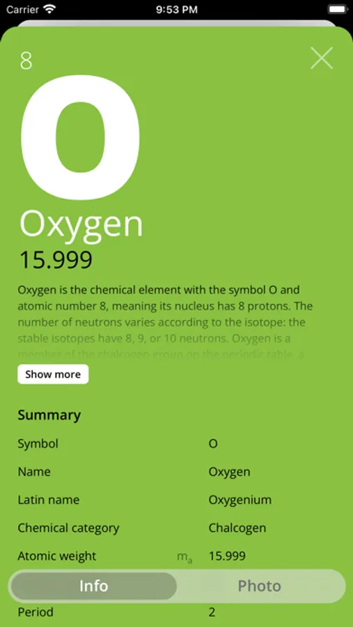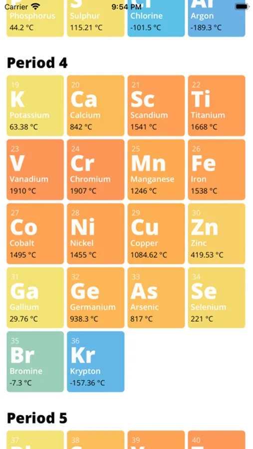 Periodic table provides more than 50 properties for each element. Besides basic attributes, such as atomic weight and oxidation states, elements are packed with key properties like boiling and melting points, density, resistivity and conductivity, and enhanced with advanced data such as ionization energies, spectral lines, half-life period and so forth.