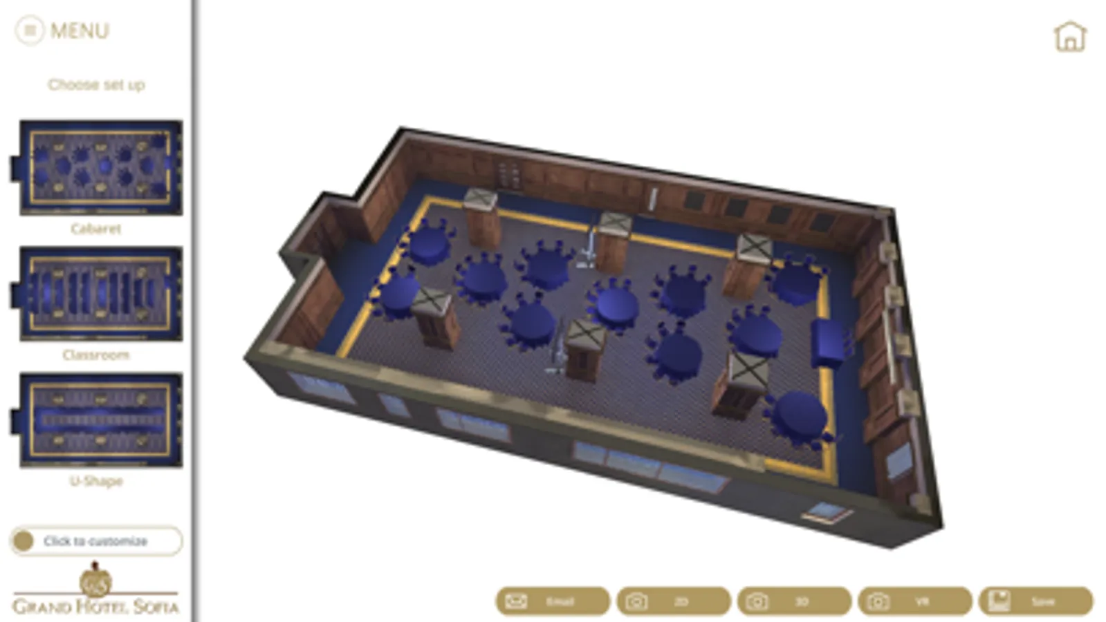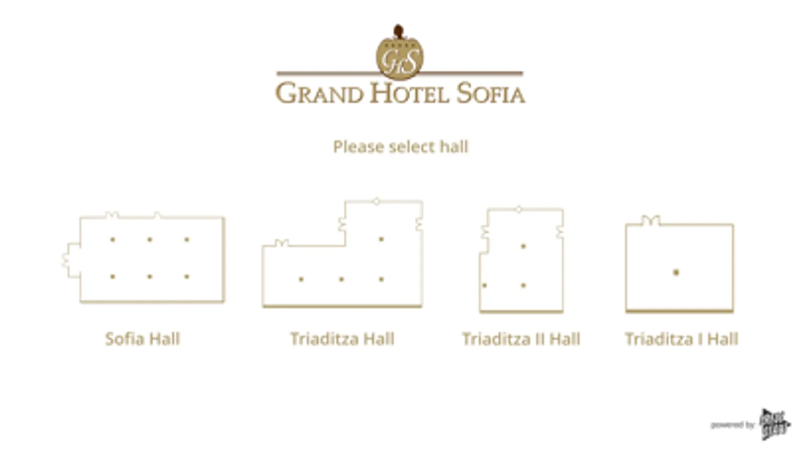 Select the furniture and setup that are most suitable for your occasion - Grand Hotel Sofia is the perfect venue for weddings, conferences, expos, seminars, and much more. After you’ve put together your ideal layout, look around in 2D (floor plan view), the 3D model of the hall, or in Virtual Reality. The photorealistic look of ‘Sofia’ and ‘Triaditza’ halls allows for the organizers to imagine their upcoming event down to the smallest detail. Upon finishing the setup you can directly send it as an inquiry to Grand Hotel Sofia’s staff and get a custom-tailored offer.