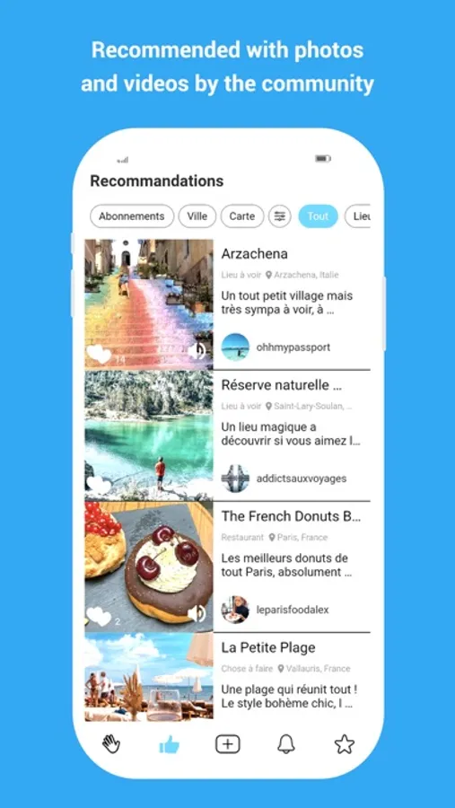 Browse the news feed to discover new tips and find new inspirations, or search directly for the best addresses for your next trip by entering your destination and using the different categories.