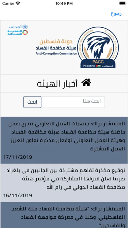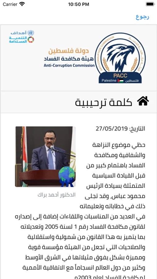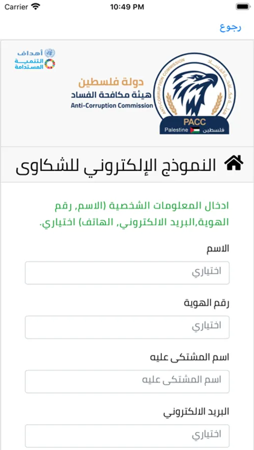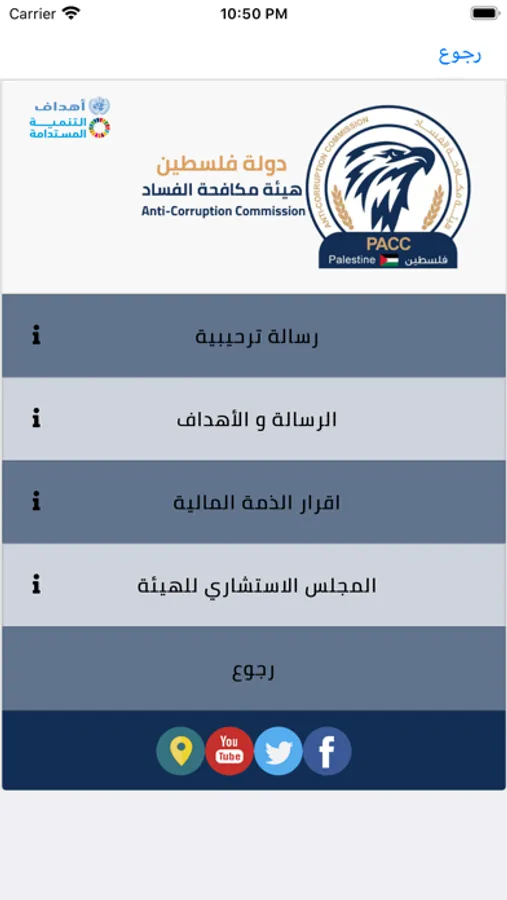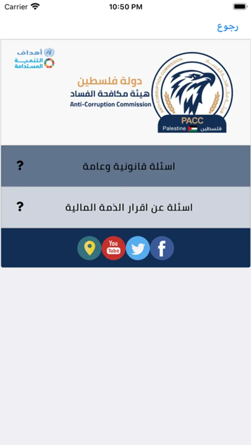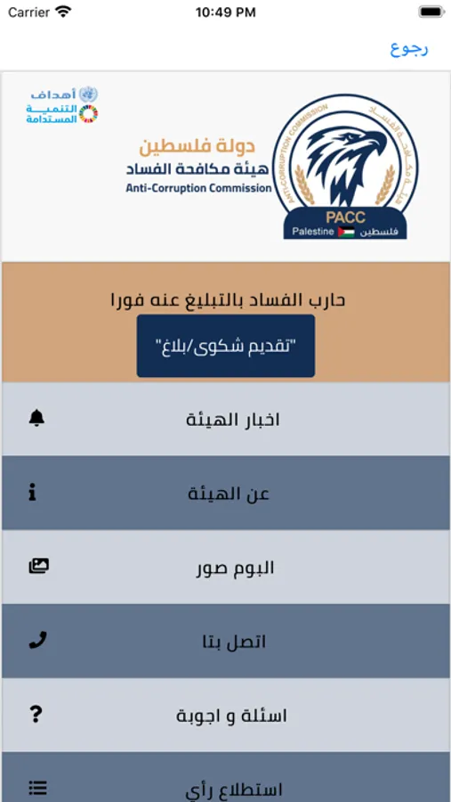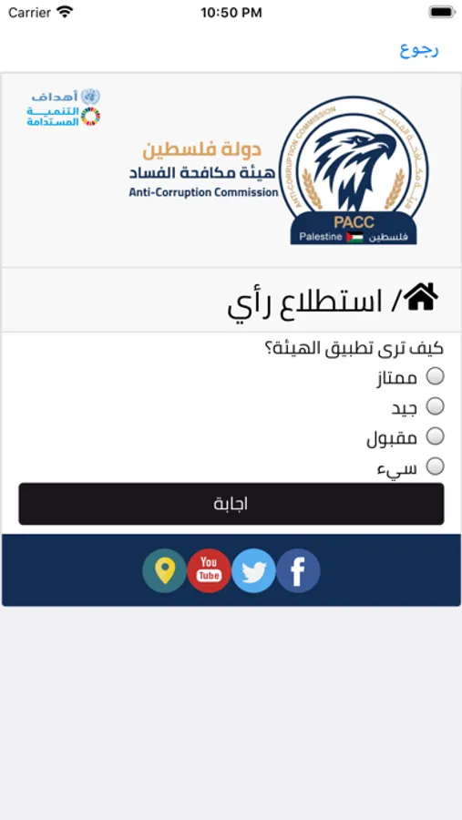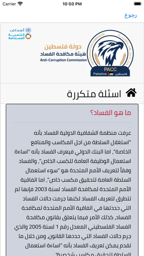 Palestinian Anti-Corruption Commission application allow citizens to view the latest news and achievements of the commission and provides the possibility of filing a complaint and communicate with the commission and answer the opinion polls put forward by the commission and access the financial disclosure and it’s conditions and see the most frequently answered questions the citizen should submit complaints and communicate with the Commission by exploiting modern technologies.
