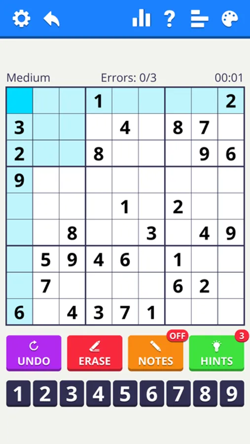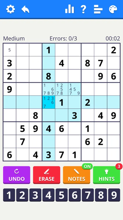 - Turn on Notes to make notes as on paper. Each time you fill in a cell, notes are automatically updated!