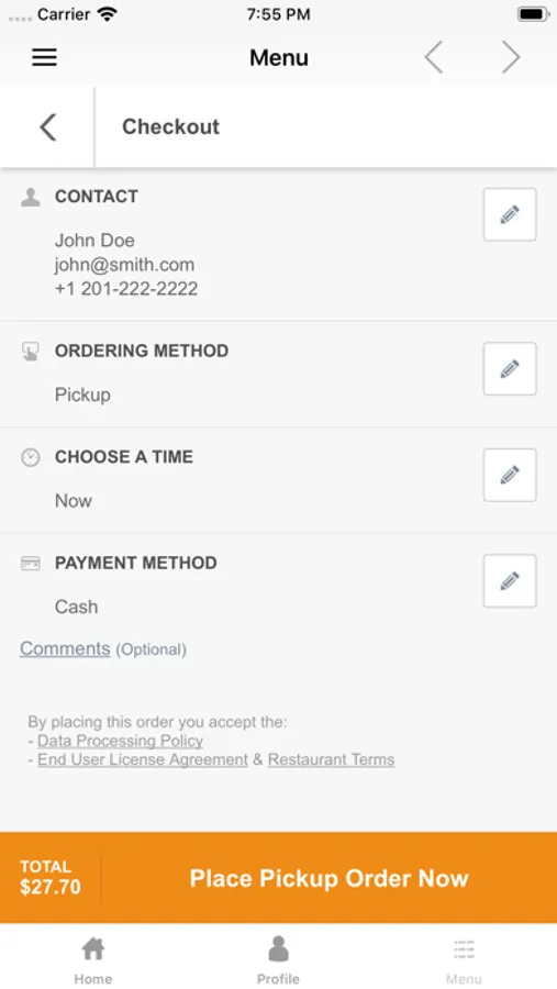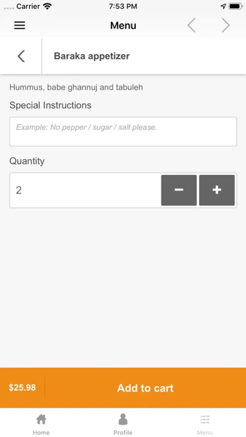- Browse the restaurant menu and customize your options