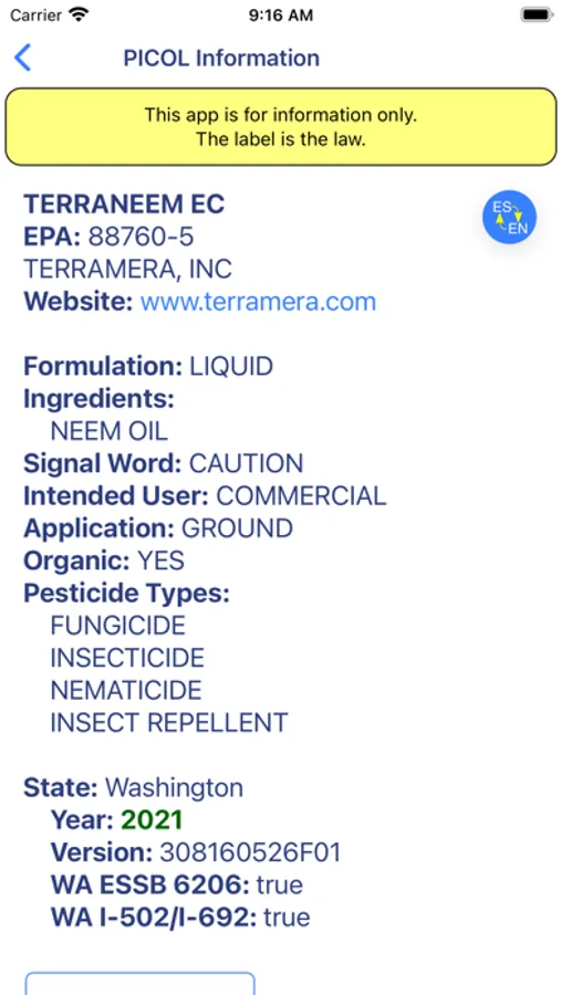 The Pesticides Label, Now!™ app is for information and educational purposes only.It is not a substitute for obtaining and understanding the information on the pesticide labels. The information in this app has NO legal status. Remember, THE LABEL IS THE LAW.