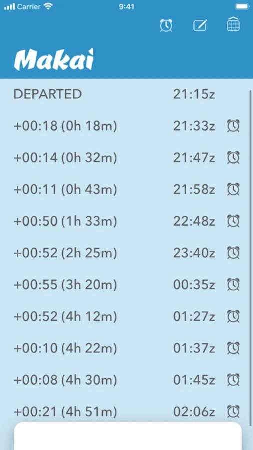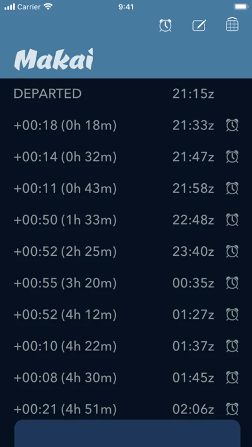 Set alarms for approaching a waypoint ETA, at a waypoint ETA and 10 minutes past a waypoint ETA to remind you to perform notations, plots or any other company requirement. Alarms can be activated or deactivated for any waypoint ETA by selecting the alarm icons on the flight time log.