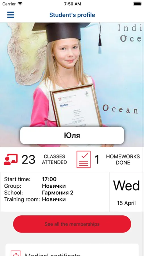 The application will help you keep track of the schedule, complete homework, receive educational materials, give feedback to the teacher, and pay for classes.