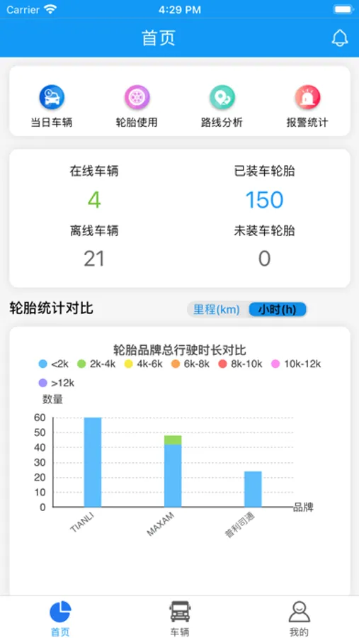整个系统实时管理每一条接入系统的轮胎。一条轮胎从用户开始使用,可以实时查看轮胎的胎温、胎压、行驶里程、使用时长,计算轮胎磨耗。可以设置温度、压力报警,当轮胎的胎温、胎压没有在正常范围内时,驾驶员可以接收到驾驶室内的显示器的声音报警,轮胎管理人员会在手机端收到推送的报警信息。