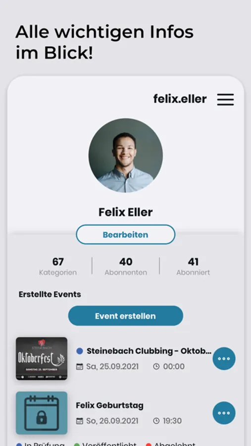 Die besten Partys, Messen, Seminare, Sportevents und anderes in einer App vereint. Finde coole Events in deinem, auf dich abgestimmten, Feed. Folge Freunden und verfolge auf welchen Events diese waren oder noch gehen.