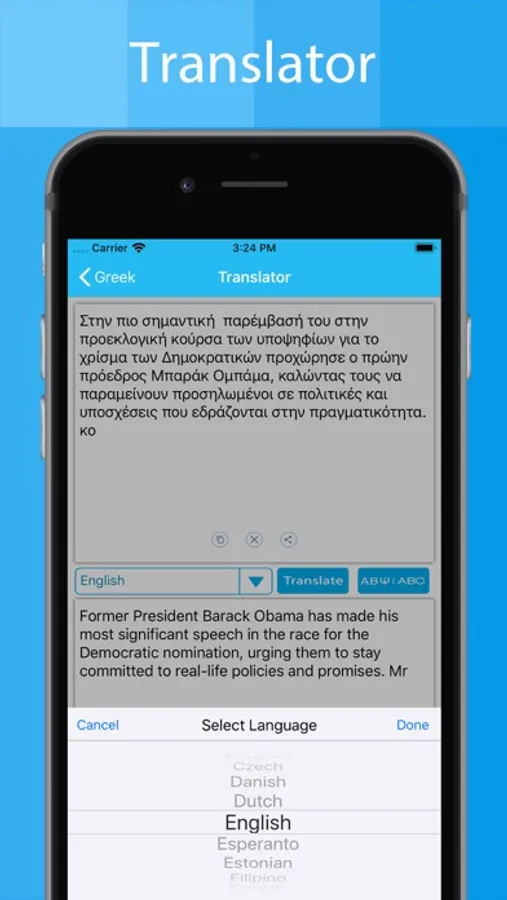 Greek Translator app will allow you to translate message, story and you can share translated text to your friends and family bye Facebook, twitter and emails.