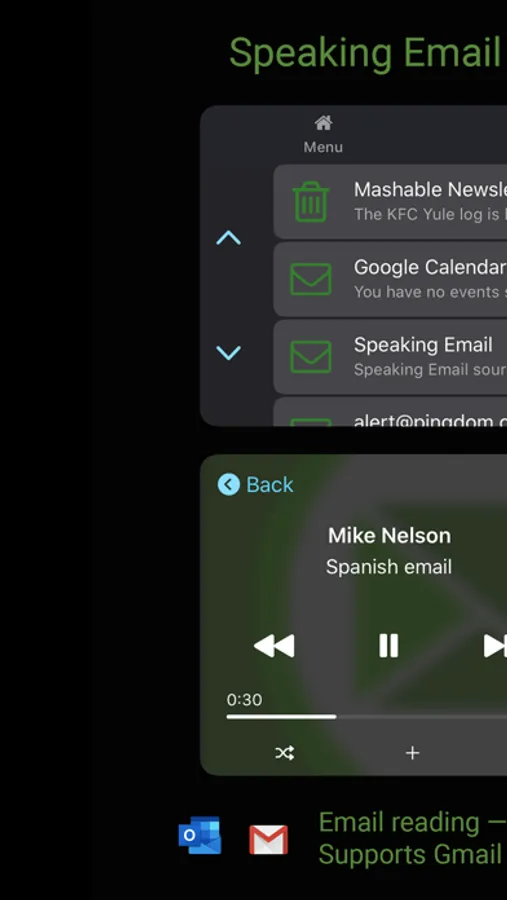 Be productive on the road by having your email read to you, with buttons to archive/mark-as-read, trash, or flag.