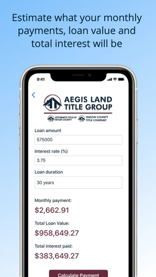 • Enter the loan amount and interest rate to get an estimate of what the monthly payment would be, as well as the estimates of the total loan value and interest to be paid.