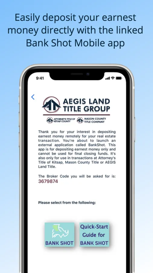 • Easily deposit your earnest money with us via the Bank Shot Mobile app.