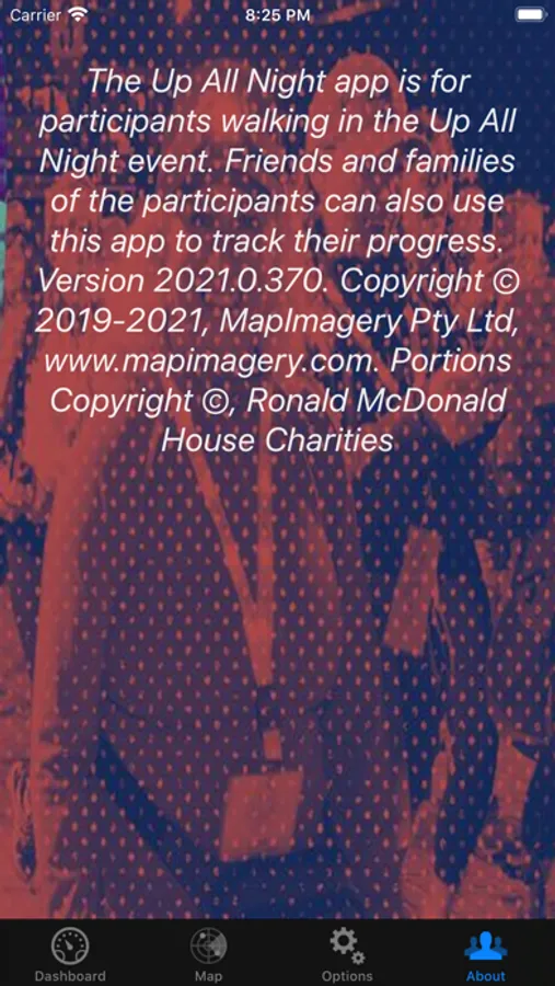 The Up All Night app is for participants walking in the Up All Night event. Friends and families of the participants can also use this app to track their progress.