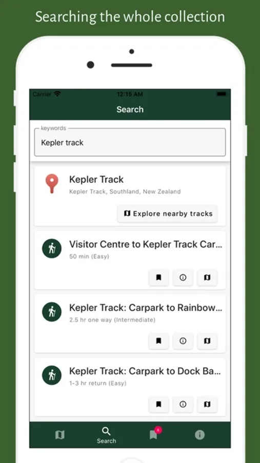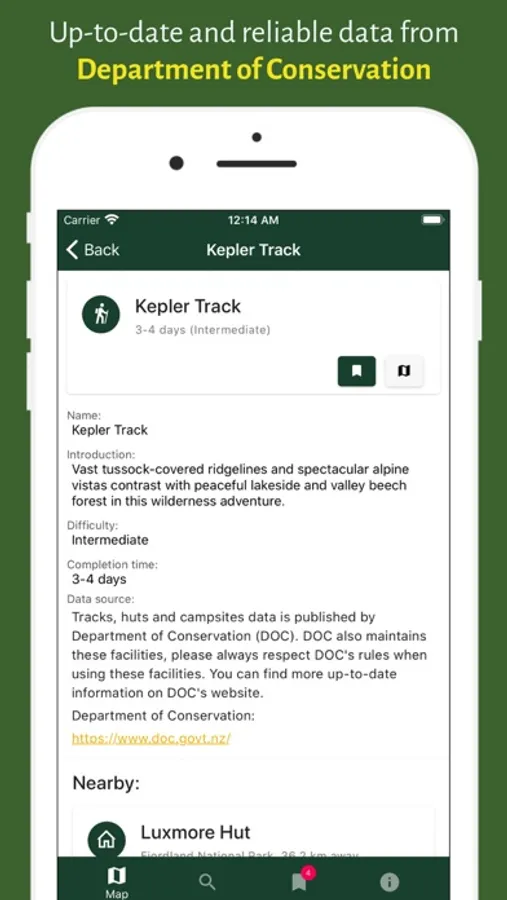 - view information published by DOC about any tracks, huts and campsites.