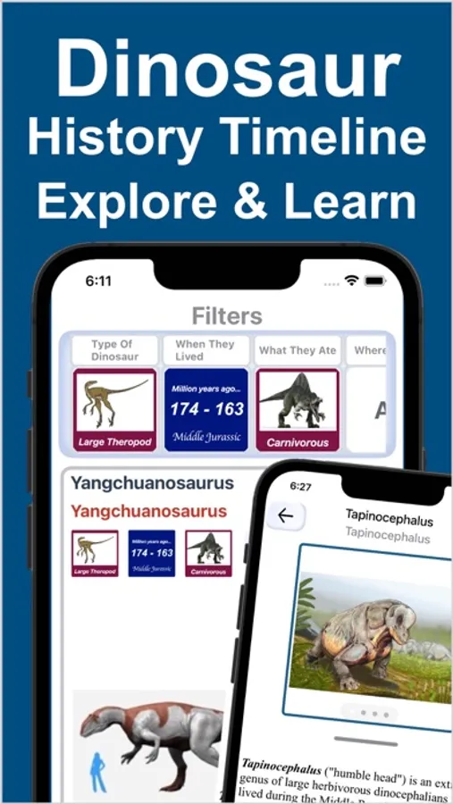 Identify similarities between dinosaurs using our timeline page where you can see each dinosaur and its era along with time information about when they lived.