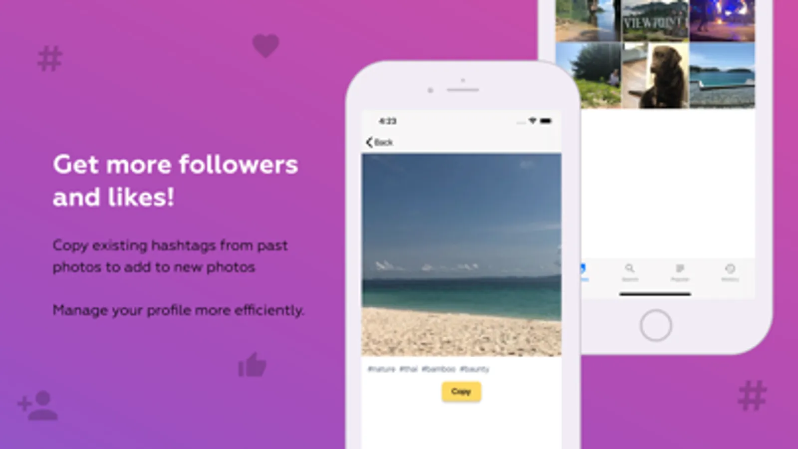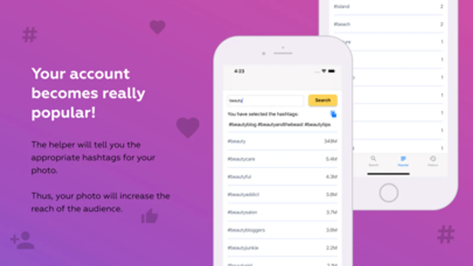The application will help you increase the number of views of your photos, publications. Just copy and paste the desired hashtags.