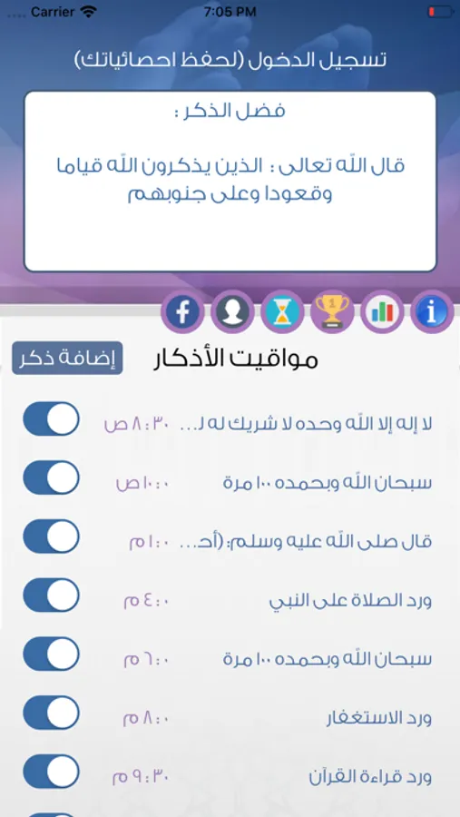 تطبيق يساعدك بمشيئة الله تعالى على الحفاظ على تثبيت أوراد لذكر الله تعالى فالتطبيق يعمل على تذكيرك بمواقيت الأذكار