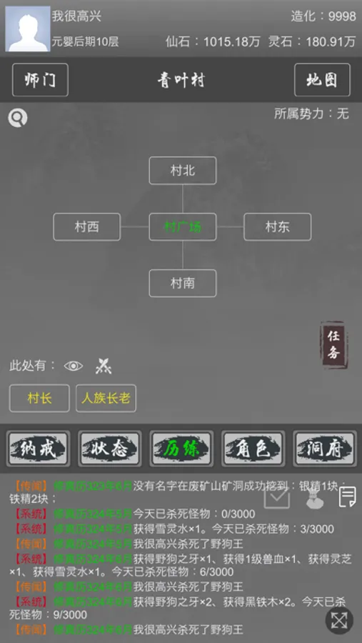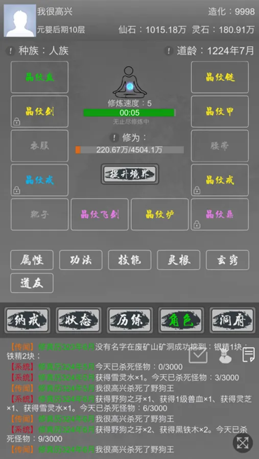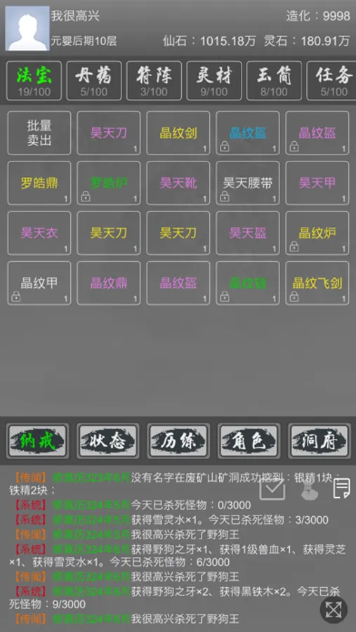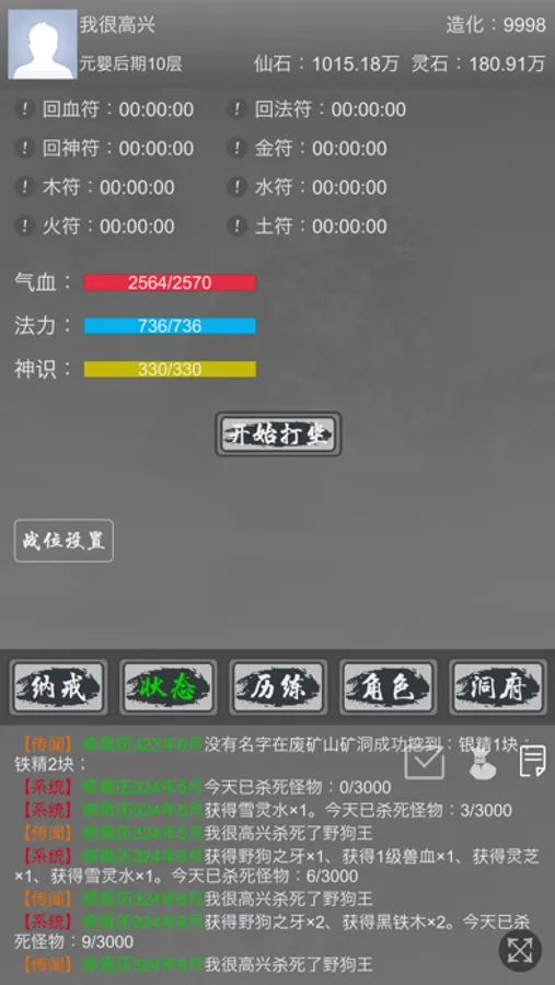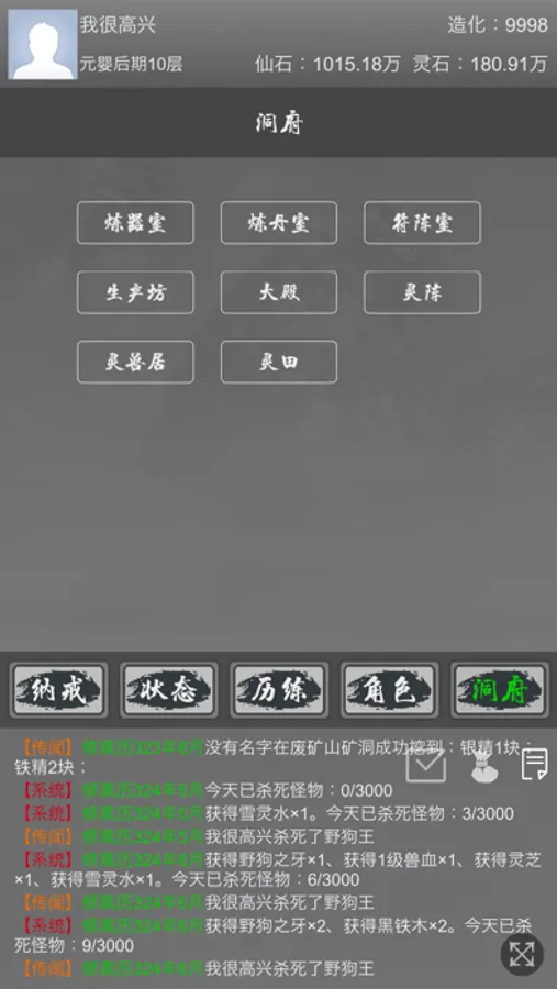 洞府:自由生产资源,可用来培养灵兽,升级阵法等。