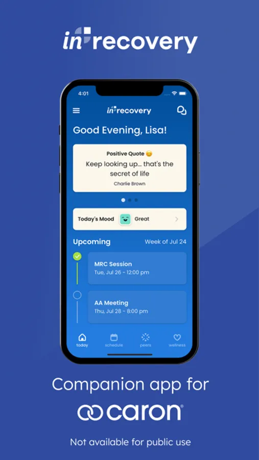 Welcome to inRecovery Connect for Caron, helping people navigate their recovery journey to heal, reintegrate and thrive. This is a private companion app for members enrolled with Caron.