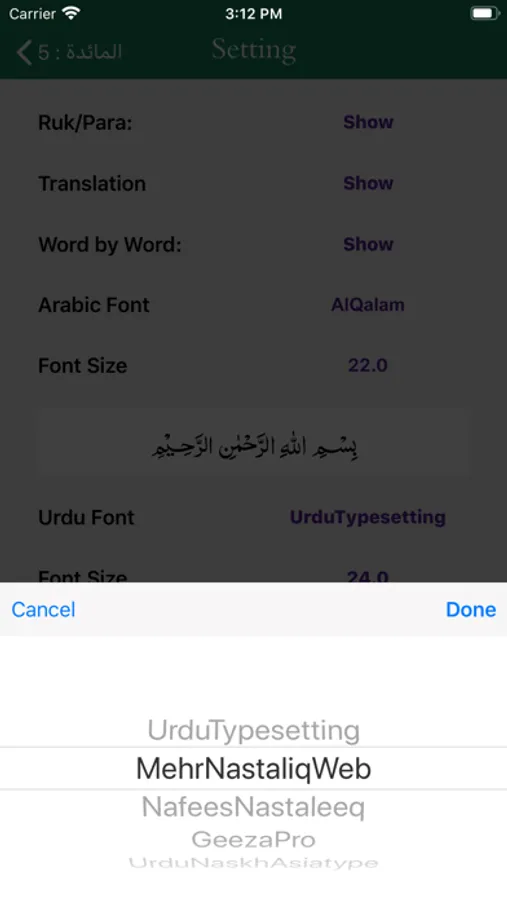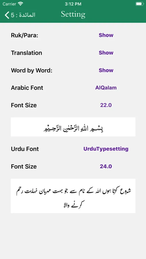 - Ability to show/hide Word by Word, Quran Translation (Tarjuma)
