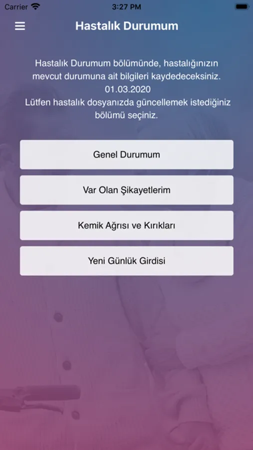 Hoşgeldiniz, Mumi uygulaması, multipl miyelom hastalığınızı etkin bir şekilde izlemenizi ve kayıt altına almanızı sağlamak amacıyla hazırlanmıştır. Bu uygulamada hastalığınıza ilişkin şikayetlerinizin varlığı ve yokluğunu, şiddet derecesini kaydedebileceksiniz. Bunun yanı sıra ilaçlarınızı, raporlarınızı ve randevularınızı da kaydedip, izleyebilirsiniz. Mumi uygulamasını hemen indirin ve kullanmaya başlayın.
