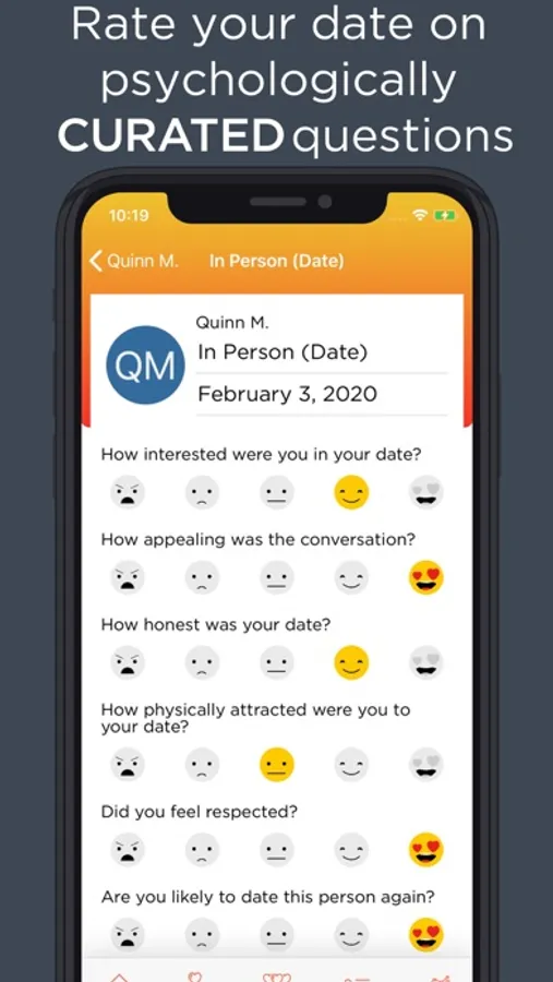 Rate each dating activity (in person date, texting/SMS, email exchange, or phone call) using the seven core, psychologically curated questions. By rating your date 0-5 (select no emoji to give a rating of 0), they get an objective score that you can track over time.
