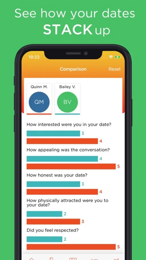 Once you have rated two or more different dates you can see how the ratings compare. How do your dates stack up? Are there glaring or subtle differences? Who should you continue with?