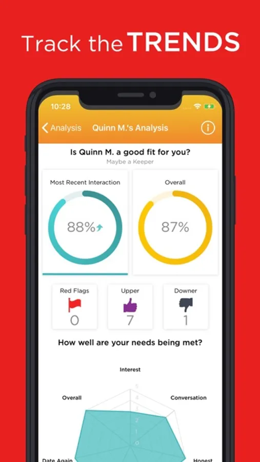 The analysis screen shows you how a person is trending and gives you an overall summary of that date’s score, uppers, downers, and red flags.