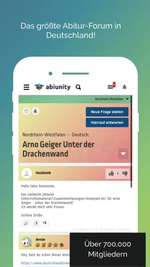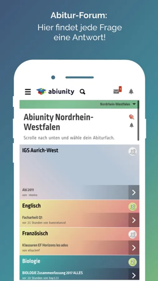 Hier können sich Schülern und Schülerinnen schulübergreifend auf das Zentralabitur in ihrem Bundesland vorbereiten. Doch nicht nur für Schüler ist die Abitur Community gedacht, sondern auch für Lehrer oder andere freiwillige Helfer, die die Schüler auf ihrem Weg durchs Abitur unterstützen wollen. Alles was dem Austausch dient und anderen Hilfe bieten könnte, kann hier gesammelt werden: ob Präsentationen, Referate, Texte, Hausaufgaben oder Sonstiges. Auch Fragen treffen hier auf Antworten.