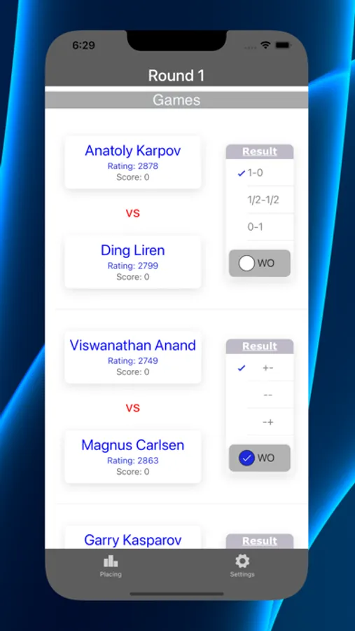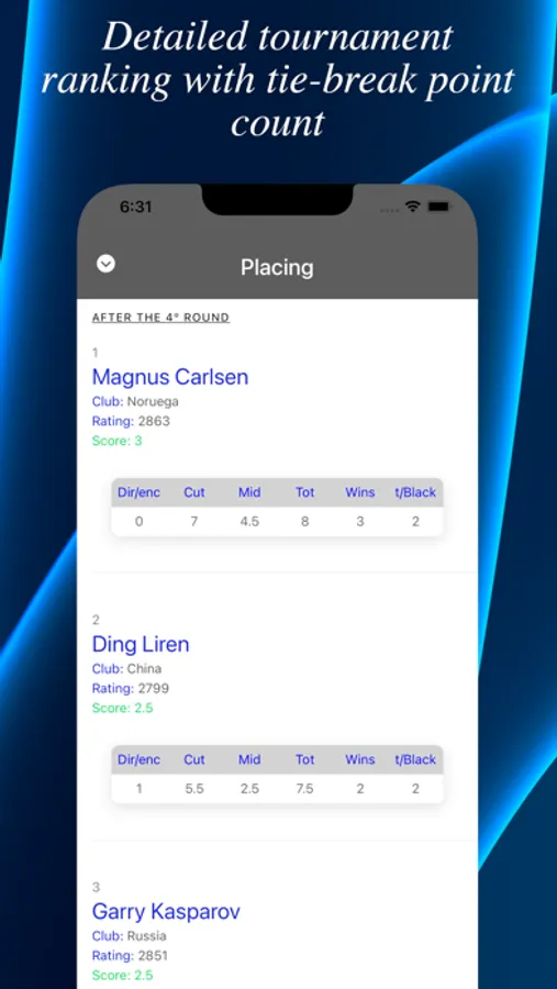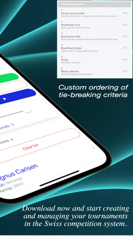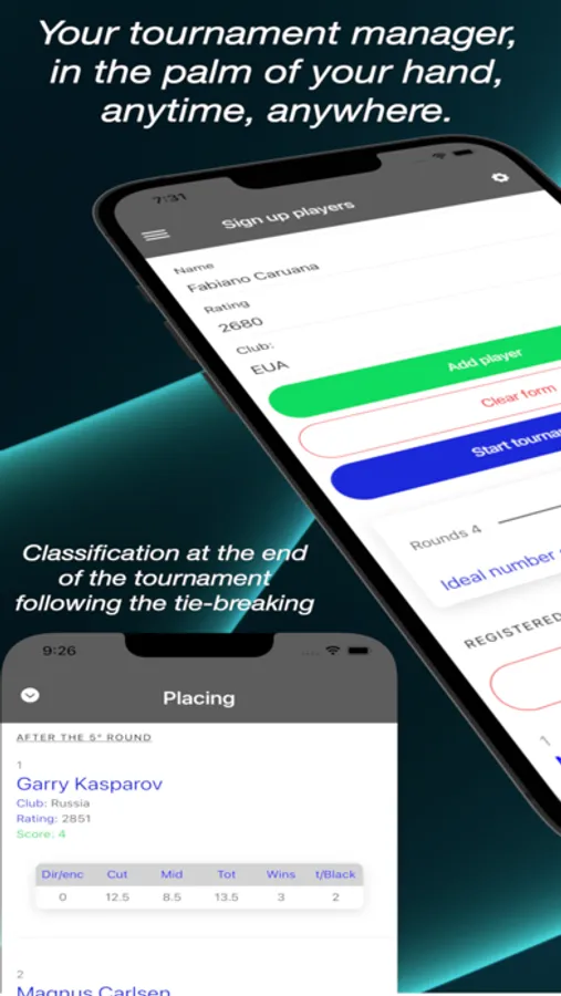 Application that makes pairing in the Swiss competition system, manages the tournament simply and easily, without any complications, can be used for chess tournaments, checkers and other sports.