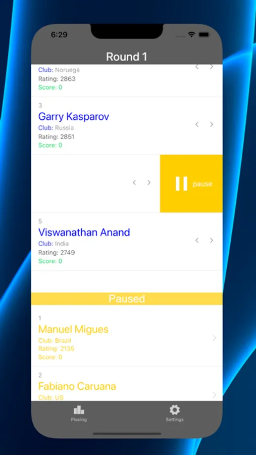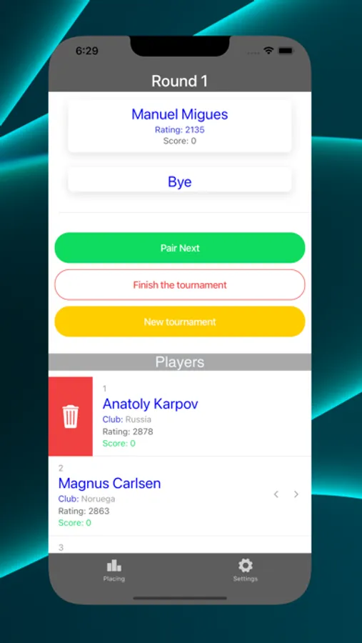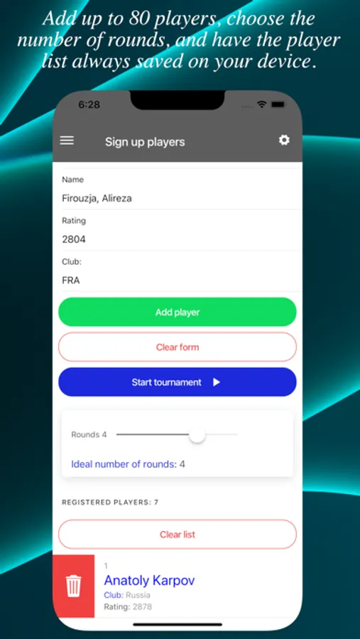 Add players to the tournament and set the number of rounds, you must have at least 7 players to start the tournament, you can delete players from the subscribers list by sliding the item to the right.