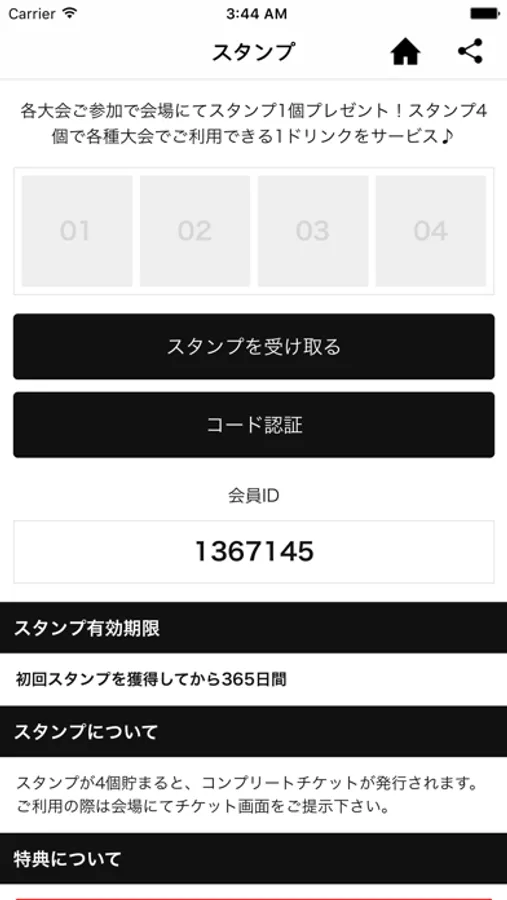 アプリ限定のスタンプカード。各種大会にご参加でスタンプをプレゼント。