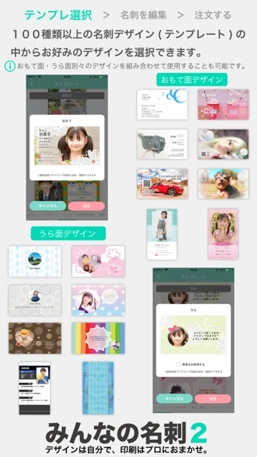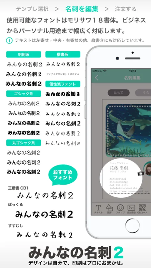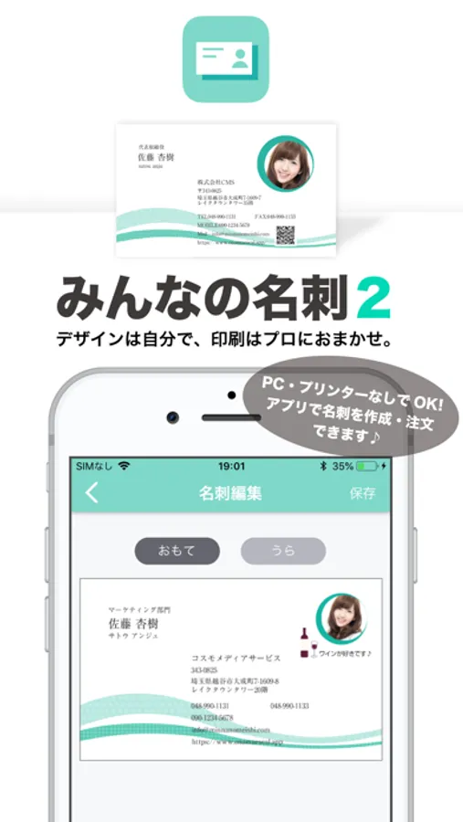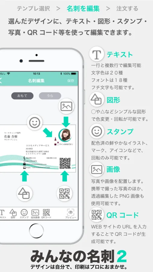 〜思い通りの名刺をデザインして、印刷はプロにおまかせ〜「みんなの名刺2」はこんなアプリです。