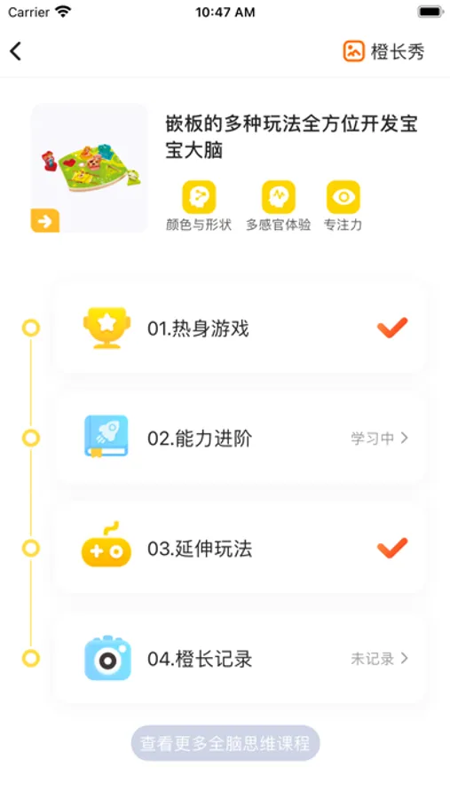 宝宝上能力进阶早教课,分龄分阶的亲子课,家长先看指导视频,再陪宝宝玩,每天15分钟快乐陪伴,循序渐进培养宝宝四大能力。由于课程是根据宝宝当前能力发展的需要定制的,在难易度、趣味性、适龄上都更适合孩子。家长上橙长大学课,从当前月龄一直到4岁,帮家长避开育儿的坑、提升父母力,成就亲密的亲子关系。