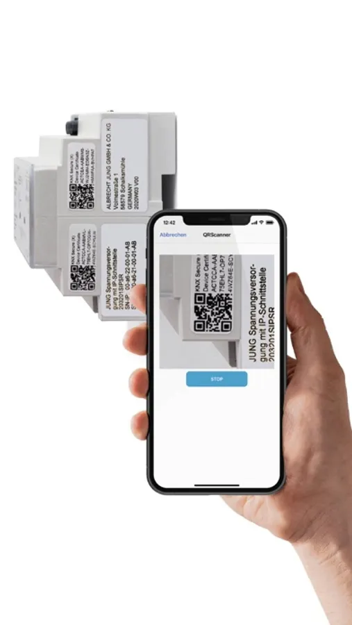 KNX Secure offers particularly effective protection through the encryption of telegrams with the AES128 algorithm. To make a KNX installation secure, specialist installers require the device certificates of the individual KNX-Secure components. They are printed as QR codes directly on the JUNG devices and must be imported into ETS.