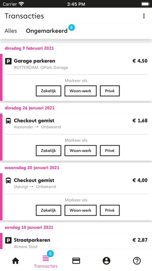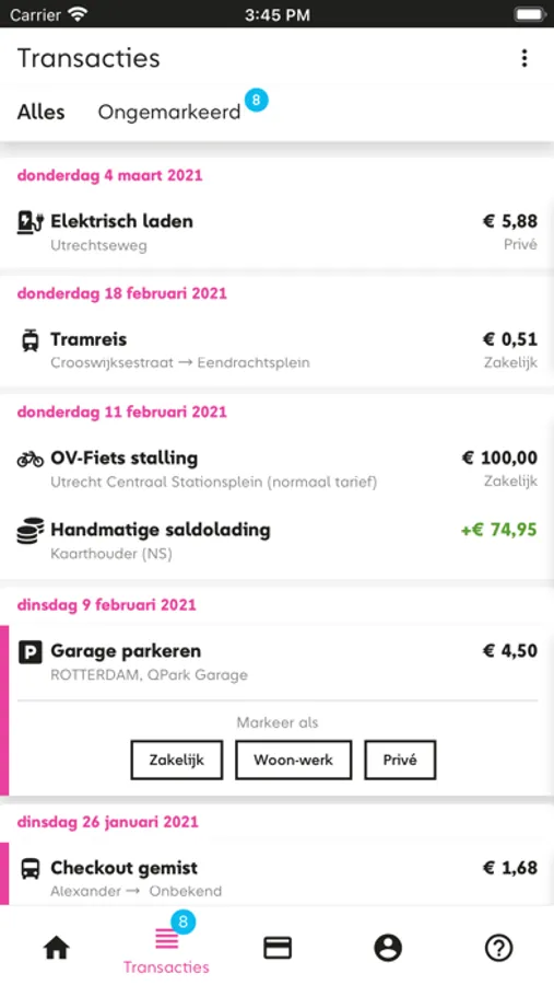 In de WijMobiel app vind je al jouw gemaakte ritten en transacties. Je kan, wanneer jouw werkgever dat graag wil, ze hier ook kenmerken als woon-werk, zakelijk of privé.