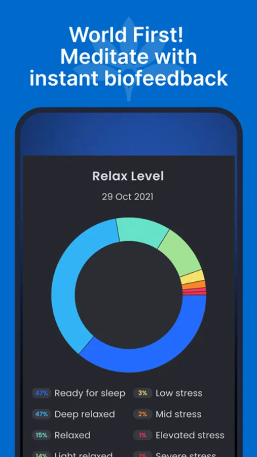 World First! RELEXA is the only app worldwide providing meditations according to the your stress level. Our stress-measuring app recommends meditations according to your state of mind and gently leads you into a state of increasing relaxation based on real-time biofeedback.