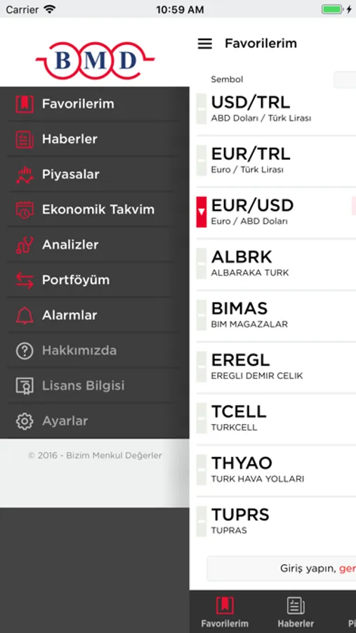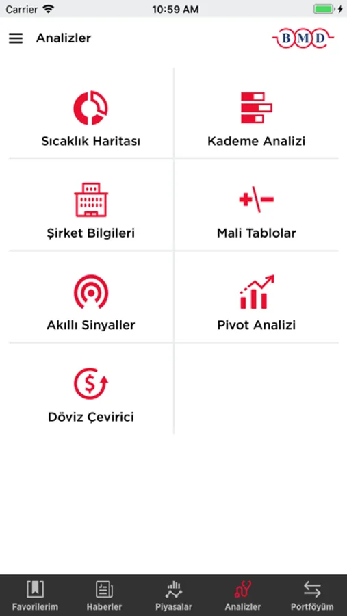 Yenilenen BMD Mobil uygulaması ile finansal piyasaları takip edebilir, anlık haber ve ekonomik bilgilerden anında haberdar olabilir ve Bizim Menkul Degerler hesabınız ile Hisse Senedi ve VİOP alım/satım işlemlerinizi hızlı ve güvenilir bir şekilde gerçekleştirebilirsiniz.