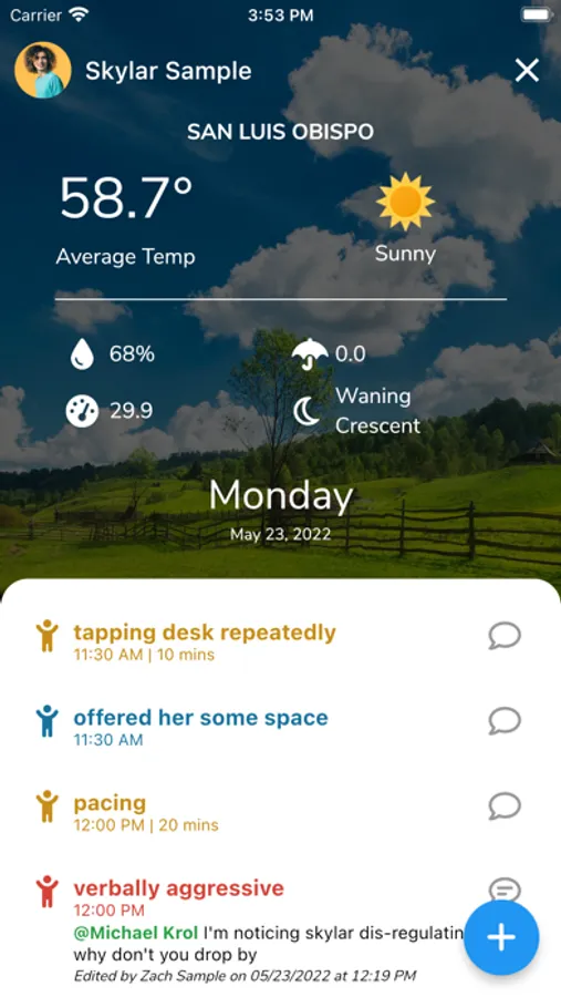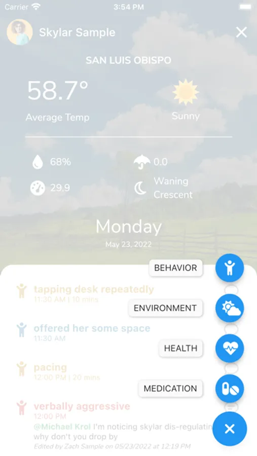 We often forget about environmental factors and the huge influence they have on behavior. A unique feature of BEHCA tracks daily weather, moon phases, barometric pressures, humidity, precipitation, and more based on location.