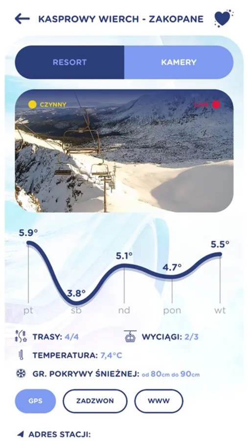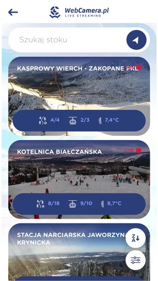 - ponad 200 widoków live z kamer z ośrodków narciarskich w Polsce