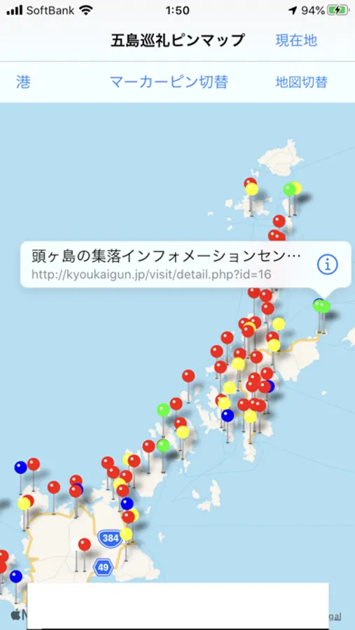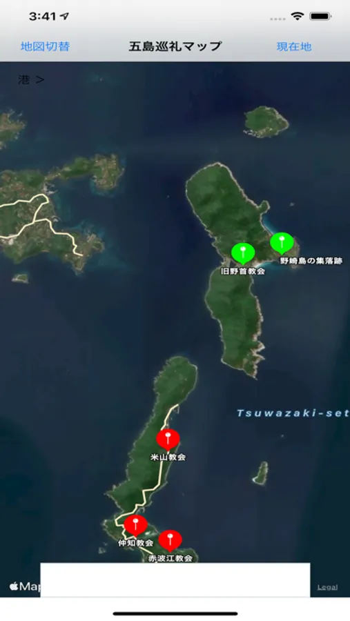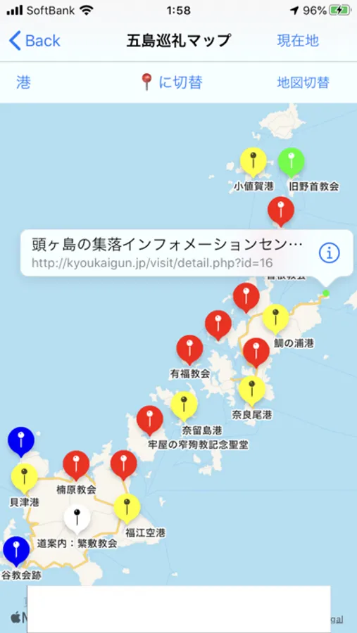 このアプリは五島列島の教会地図と関連サイトをリンクし、五島53ヶ所巡礼の案内をします。地図の種類は3種(航空写真・普通地図・ハイブリット地図)あり、現在地もタップで表示します。また港の地図と時刻表の画面を用意してます。マーカーが虫ピンタイプとタイトル表示タイプの2種類有ります。タイトル表示マーカーの地図は拡大すると隠れたマーカーが表示されます。