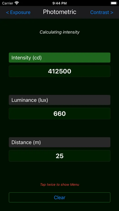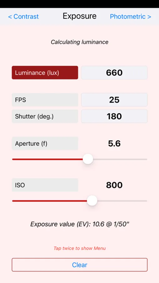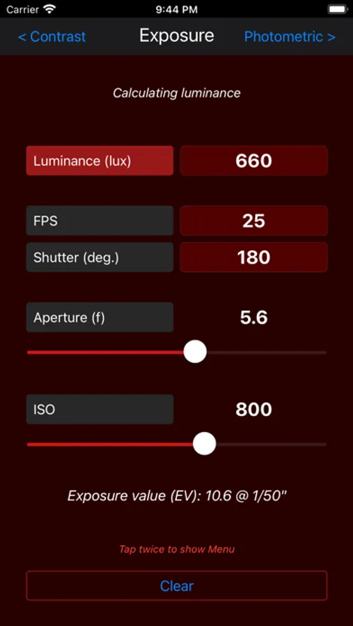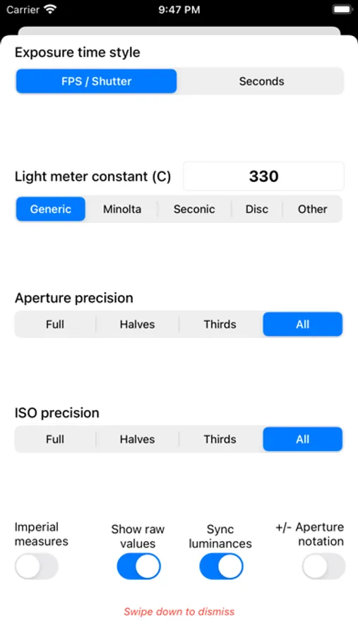 In application settings, users can choose to express exposure time as a combination of frames per second and shutter opening (video style), or as fractions of the second (photo style). Exposure time, aperture opening and sensitivity can be calculated to the precision of a full stop, half stop, one third of a stop or all three. Metric or imperial units, aperture notation (numeric or descriptive), and showing or hiding of calculated raw values for aperture, ISO and exposure time can also be chosen in application settings.