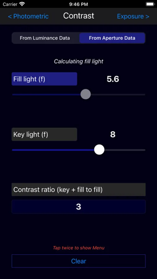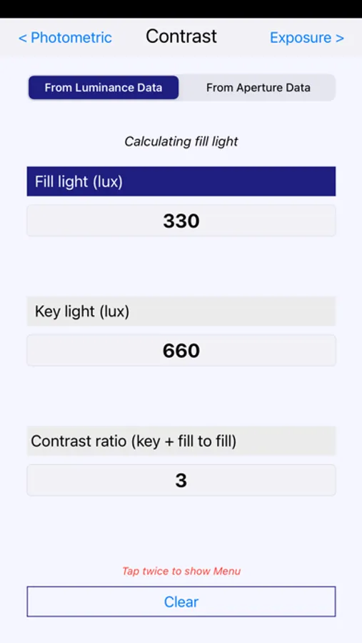 On the Contrast page: the key light to fill light ratio calculated using the formula: (key + fill) / ill. Key light and fill light values can be expressed as luminance (lux or fc) or as f-stops.