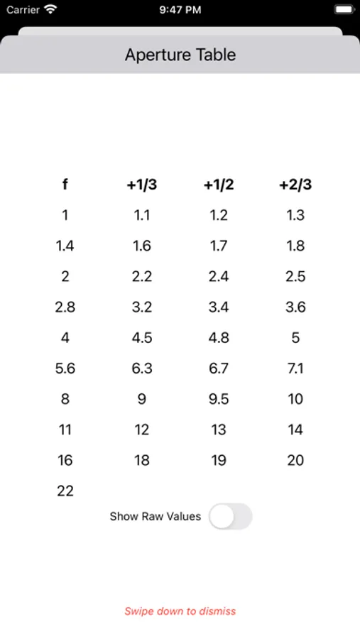 In addition, the application presents a table of aperture openings between f1.0 and f22, in full, one third, half, and two-thirds stop increments, which is very helpful when interpreting digital light meter readings. Aperture openings can be shawn as rounded or raw (calculated) values. Raw values are used in all calculations. A table of all ISO values between 6 and 25600, in full, one-third, half, and two-thirds stop increments, can also be presented.