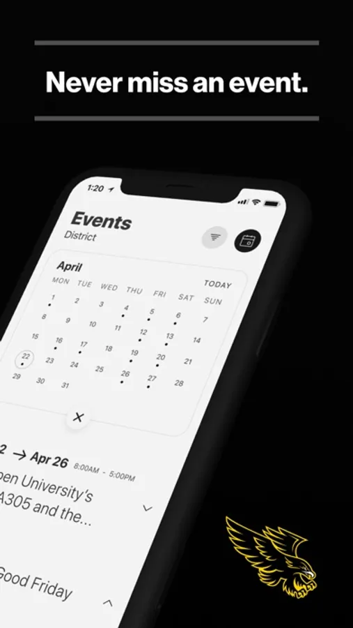 The event section shows a list of events throughout the district. Users can add an event to their calendar to share the event with friends and family with one tap.