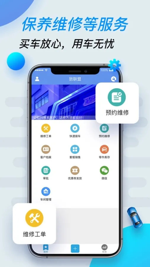 【致联盟】是专业汽车服务平台。400多家维修厂提供汽车零配件销售,二手车信息咨询,汽车租赁,汽车保养,维修,钣喷,代办车辆年审、过户、上户等一体化连锁维修服务: