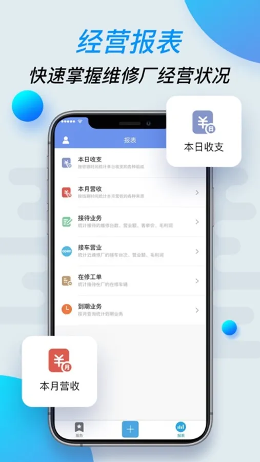 3、经营报表,管理层可以快速掌握维修厂经营状况,帮助维修厂制定营业计划;