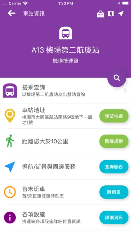 提供首末班表/發車時刻班表/車站詢問處/無障礙電梯位置/停車場/出入口/站內圖/位置圖/假日腳踏車進出等各項車站設施詳細資訊查詢!