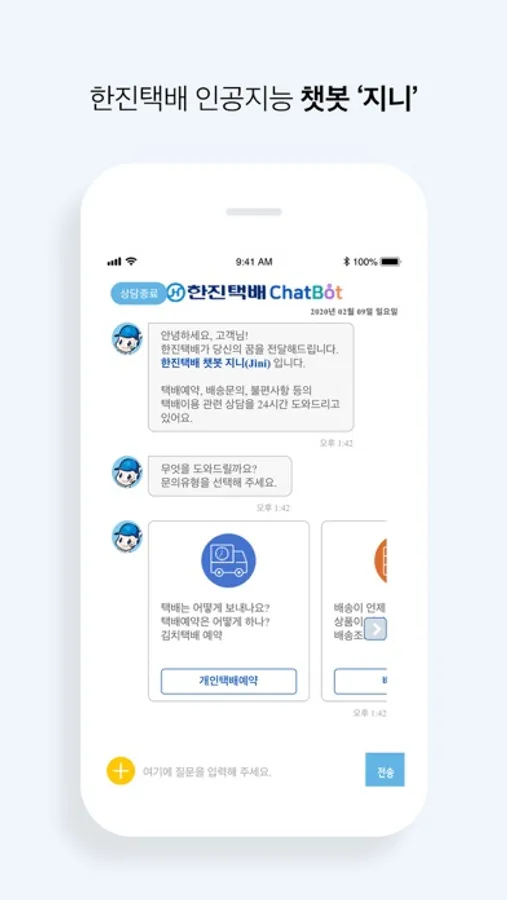 - 한진택배 인공지능 챗봇 상담 서비스 ‘지니’는 택배예약 접수 및 배송일정 확인 등의